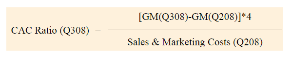 In English, Bessemer defined the 3Q08 CAC as the annualized amount of incremental gross margin in 3Q08 divided by total S&M expense in 2Q08 (the prior quarter).